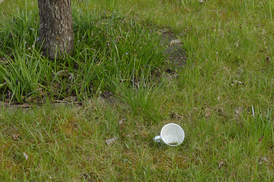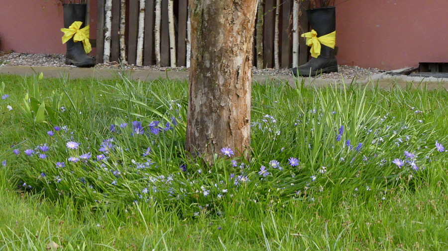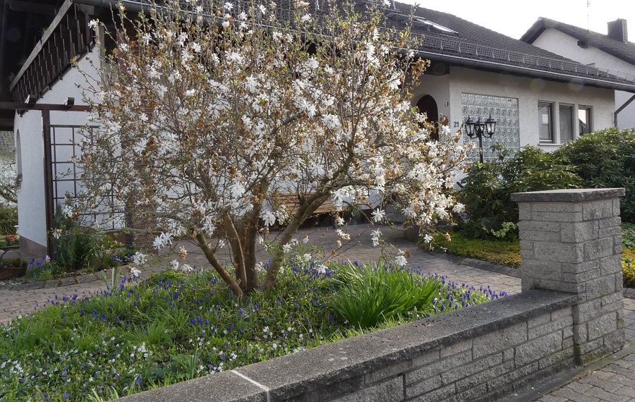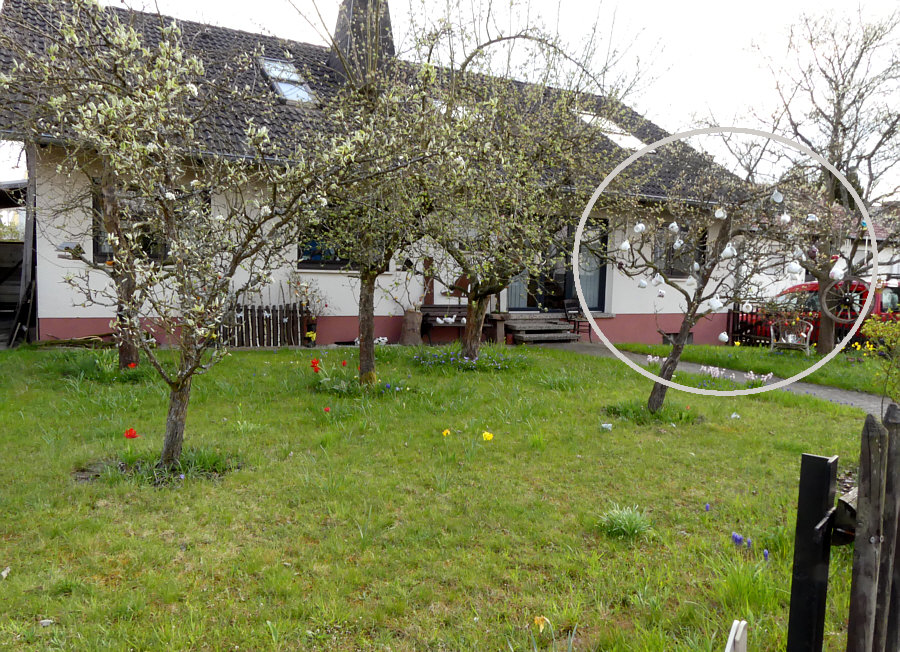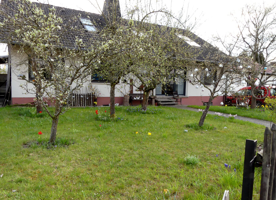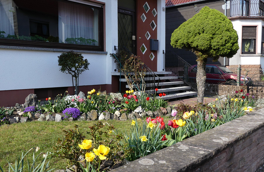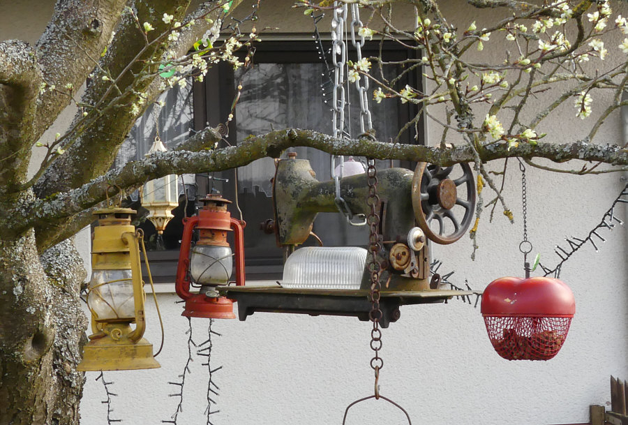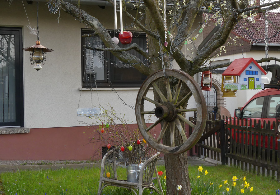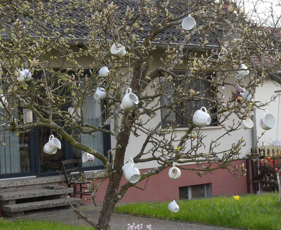 Gestern Häuser ... heute Vorgärten. Mal schauen, was mir da so in den letzten Tagen begegnet ist. 1 ![]() Hanggrundstück ... Wildwuchs, Koniferen ... und viele viele kleine gelbe Blümchen. 2 ![]() Der klassische Frühlingsvorgarten mit Rasenstück, Tulpen und blühendem Polster. 3 ![]() Magnolie, Traubenhyazinthen, Immerweiß 4 ![]() Steinreich, mit Amphore 5 ![]() Auf den ersten Blick Rasen mit Tulpen und blühenden Bäumen. Wagen wir doch mal einen zweiten Blick: ![]() ![]() ![]() Auch auf dem Boden liegen hie und da verstreut einzelne Tassen. Und ein Bewohner des Hauses steht grad hinter der Tür und schaut mir beim Fotografieren zu. ![]() Um die Baumstämme herum blüht es ... Stiefel mit Schleifen, darin Zweige mit bunten Eiern. ![]() Auch im Rasen darf es blühen ![]() Im anderen Baum hängen Laternen, ein Tablett, ein Wagenrad, weitere Deko ... und ... ![]() ... eine Nähmaschine. Eure Gedanken zu diesen 5 Vorgärten ? |