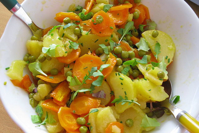 Karotten frisch gedünstet, Erbsenrest aus Dose dazu, gewürzt,