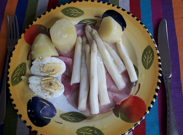 Spargel auf Schinken, mit Ei und Salzkartoffeln, etwas flüssige Butter