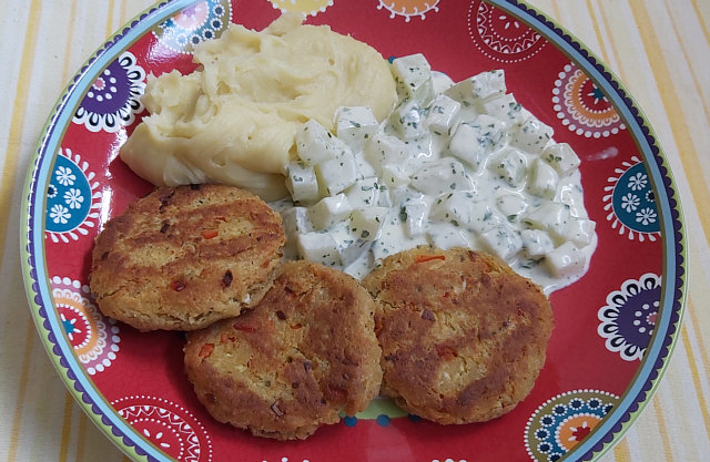 Kichererbsenlaibchen, Kartoffelpüree und Kohlrabigemüse.
