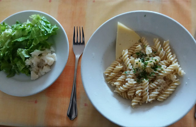 Nudeln, Scheibe Käse, Kräuter, Salat