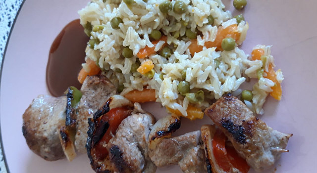 Fleischspiess mit Gemüse-Vollkorn-Reis und Ketchup.