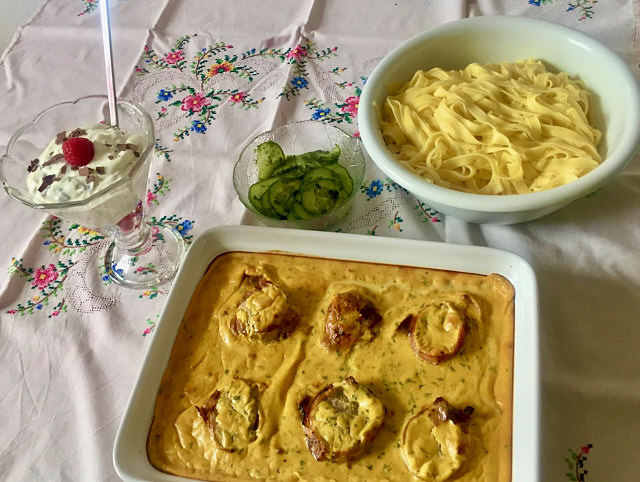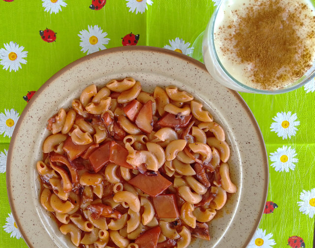 Sepia mit Hörnchennudeln und Tomatensoße, als Nachtisch Milchreis.