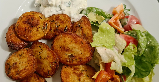 Ofenkartoffeln, die ich vorher mit Rosmarin, Thymian, Olivenöl, Salz und