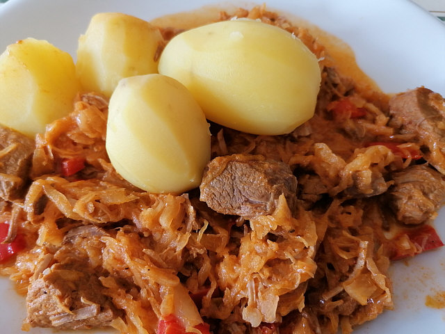 500g Schweinegulasch anbraten, Zwiebel dazu und glasig werden lassen,
