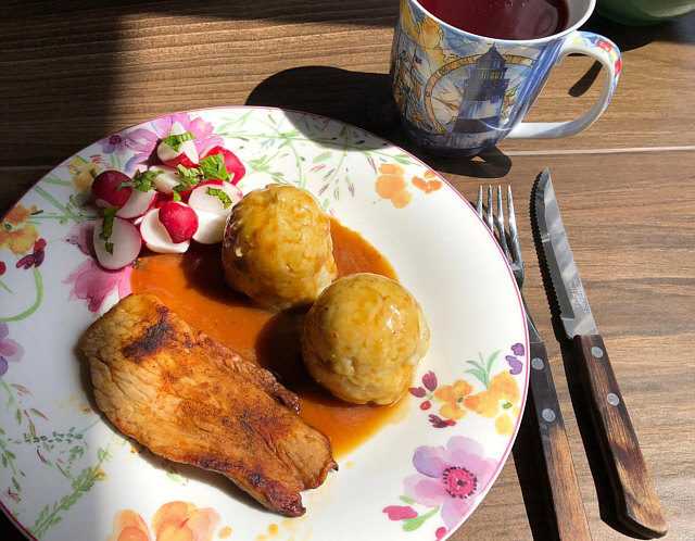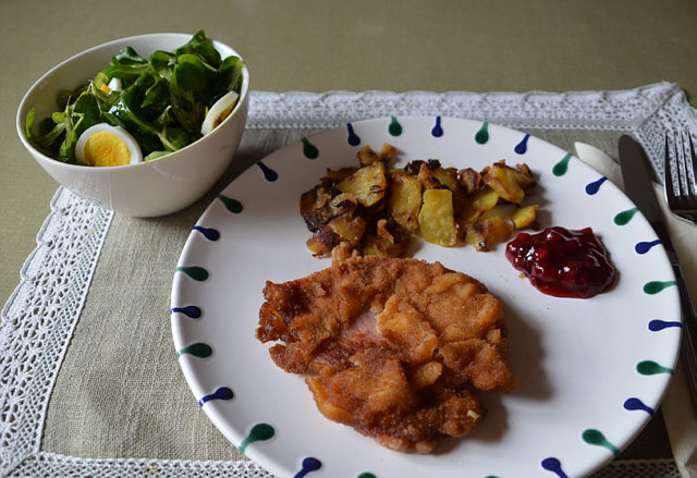 Schweineschnitzel, Semmelknödel und Multivitaminsaft.