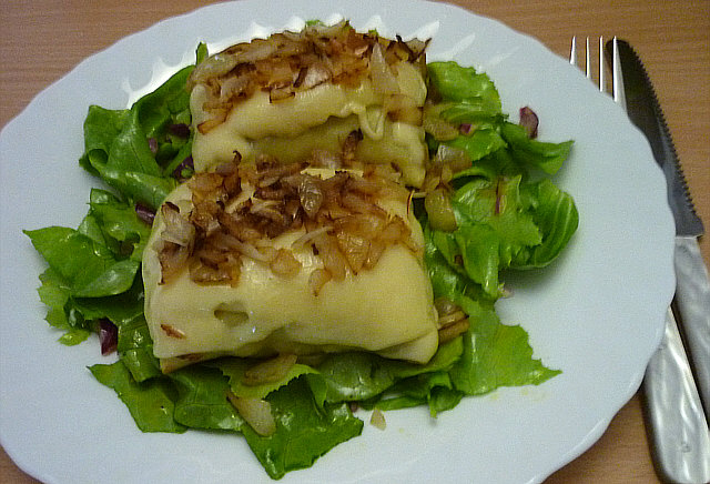 Maultaschen mit Käse und Zwiebeln auf Kopfsalat.
