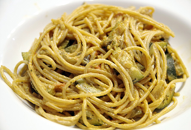 Vollkornspaghetti mit Zucchini, Aubergine und Tomaten.