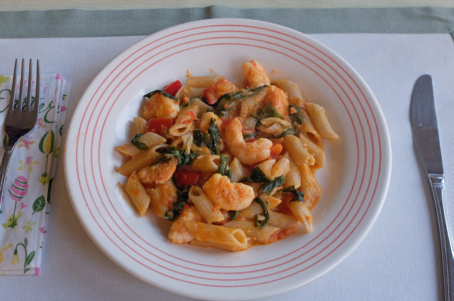 Penne mit Garnelen in Paprika-Rucola-Sauce..