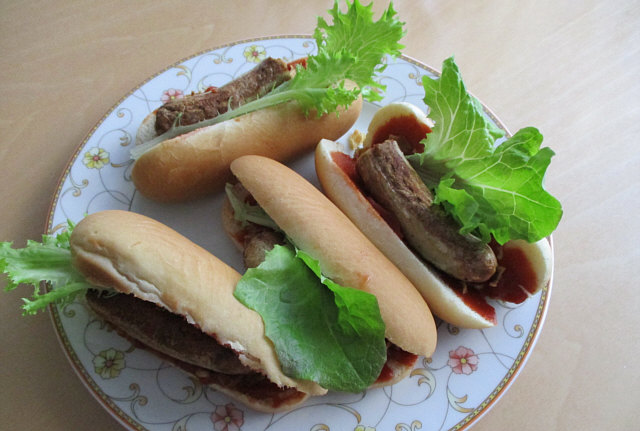 Hot Dog-Brötchen mit Ketchup, Röstzwiebeln und "richtiger" Bratwurst.