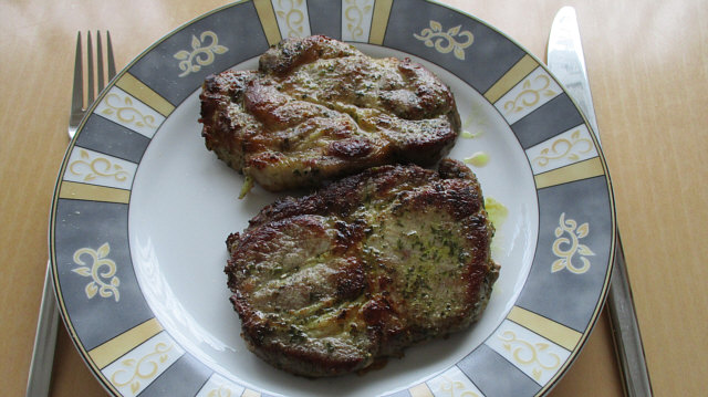 2 kleine Schnitzel in Streifen geschnitten und angebraten,