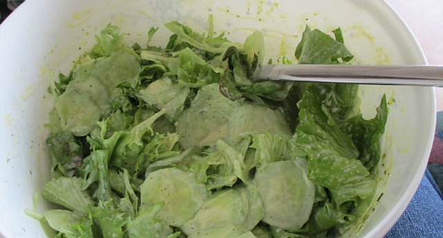 Mittags den Wurzelballen-Salat mit Gurke und abends 2 Nackensteaks in