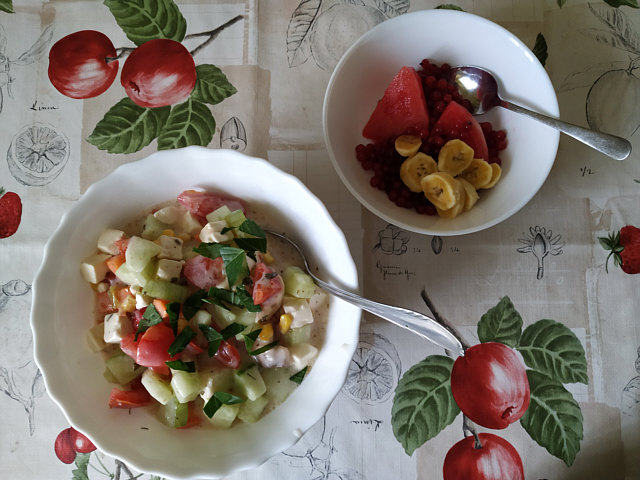 nur gemischten Salat mit eigenem Basilikum und eigene Johannisbeeren mit