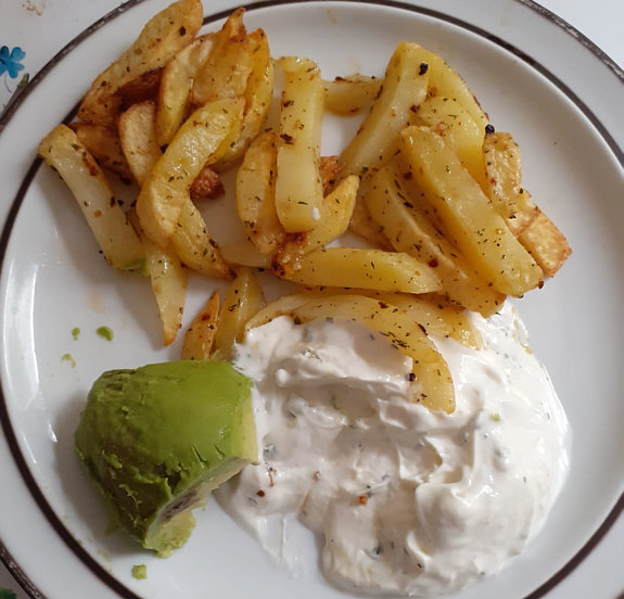 Selbst gemachte Pommes aus der Heißluftfriteuse mit Kräuterquark und
