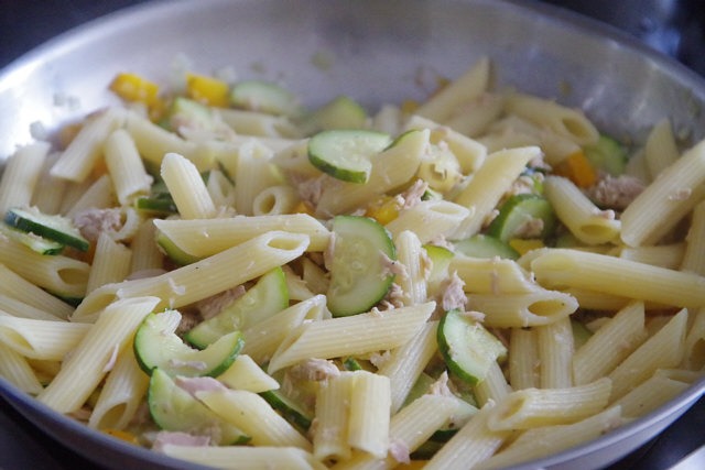 Zucchini, Paprika, Thunfisch und Penne. Dazu ein Erdinger alkoholfrei.