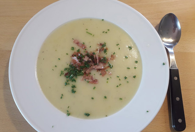 Kartoffelcremesuppe mit gerösteten Speckwürfeln.