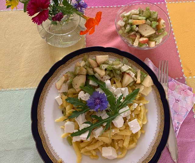 Gebratene Spätzle mit Schafkäse und Rucolagarnierung vom Balkon,