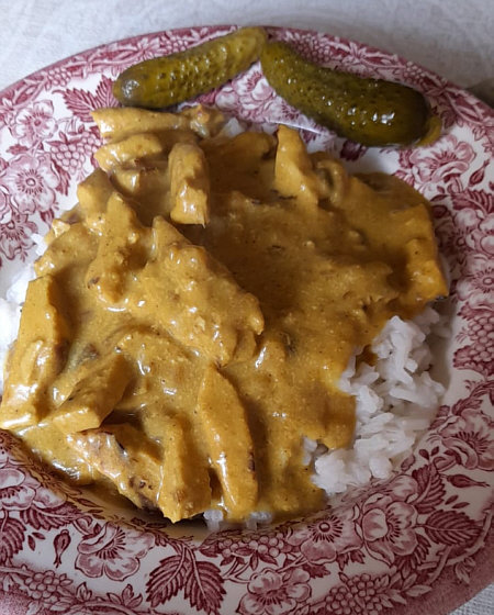 Hähnchenbrust in Curry-Sahne-Sosse mit Reis und Gewürzgurken.