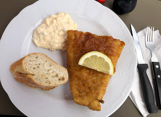 In der Imbissbude ein paar Orte weiter Seelachsfilet mit Remoulade.