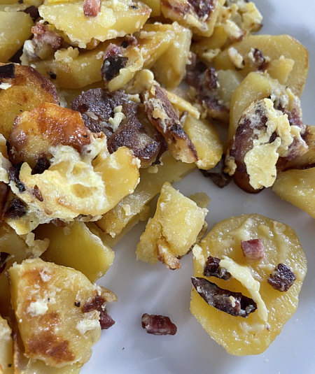 Bauernpfanne mit Kartoffeln, Zwiebel, Speck und Rührei.