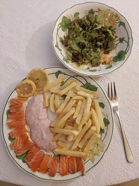 Selbst gebeizter Lachs mit Pommes und einer Joghurt-Creme und dazu