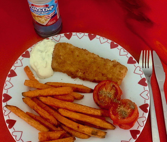 Backfisch mit Süßkartoffelpommes und heißer Tomate (und Pommes-Essig aus