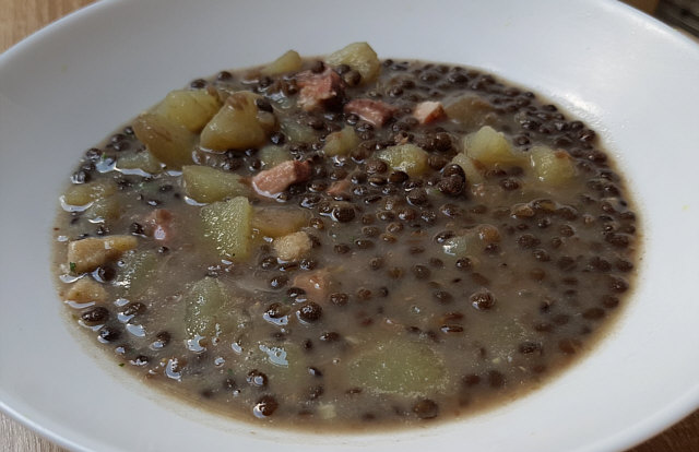 Suppe mit Belugalinsen, Kartoffeln und geräuchertem Bauchspeck.