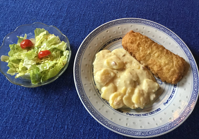 Es gab bei uns Béchamelkartoffeln mit Bratfisch (von iglo) im Backofen