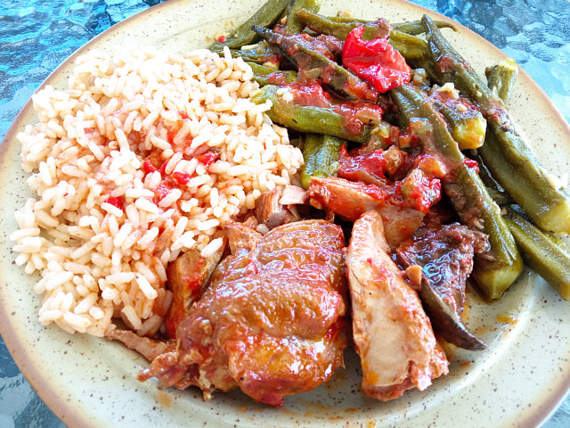 Huhn "kokkinisto" mit Reis und gebratenen Okras.