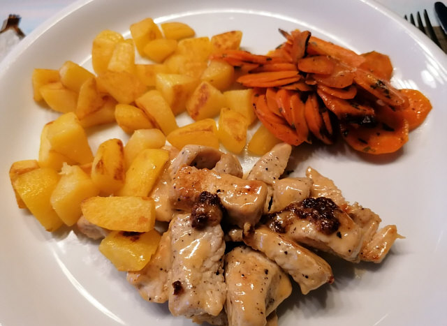 Putengeschnetzeltes, Bratkartoffeln und Möhren.