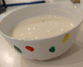 Dazu eine kalte Sauce aus: Milch, Frischkäse, Blauschimmelkäse und geh.