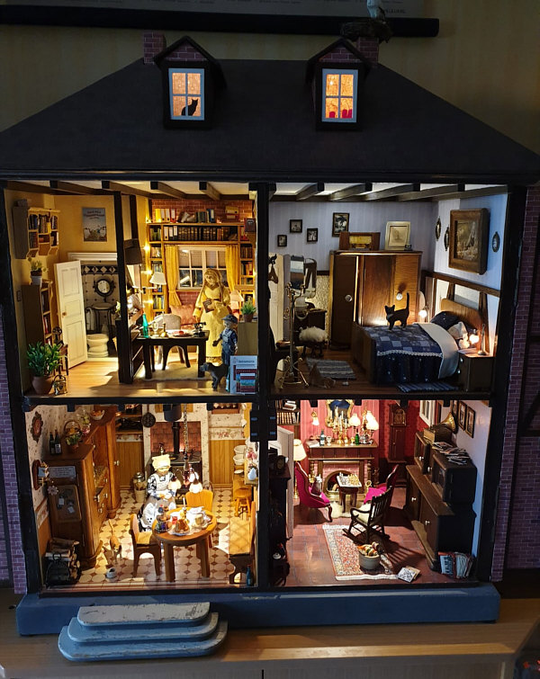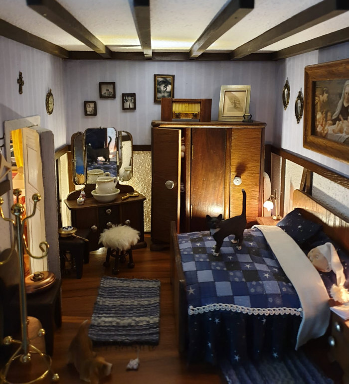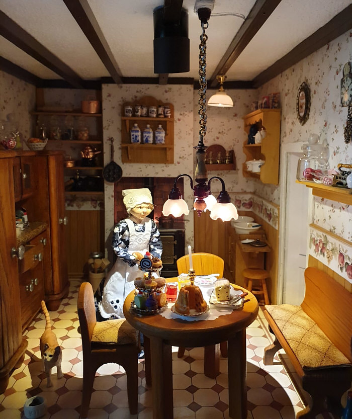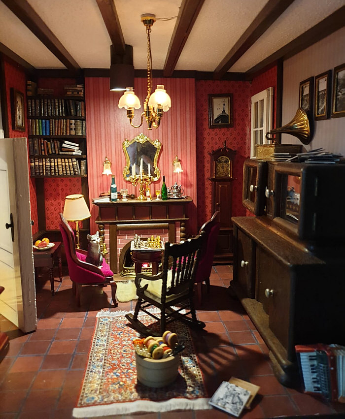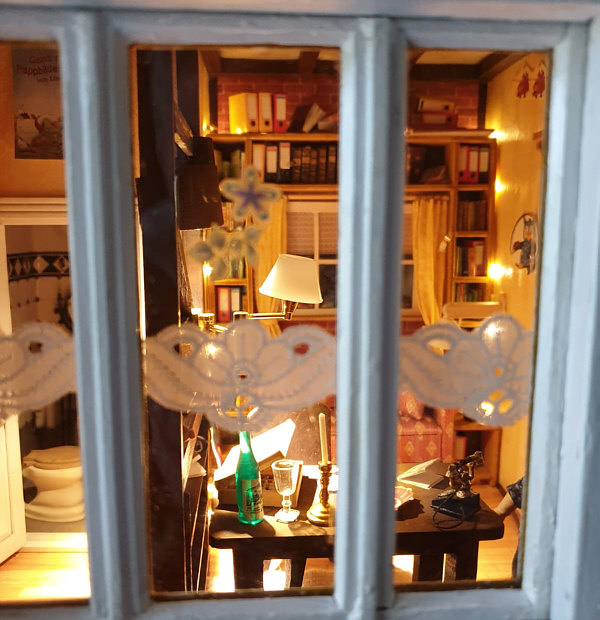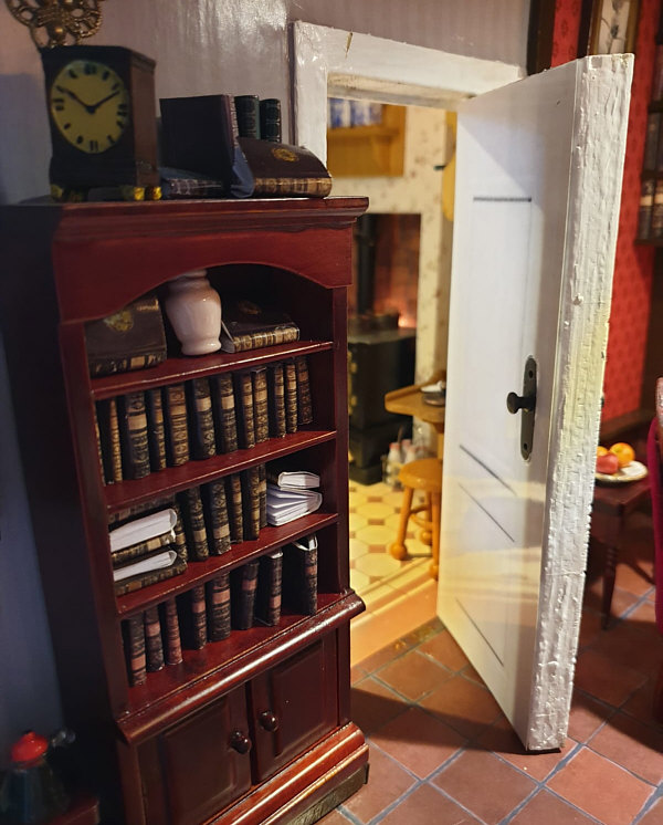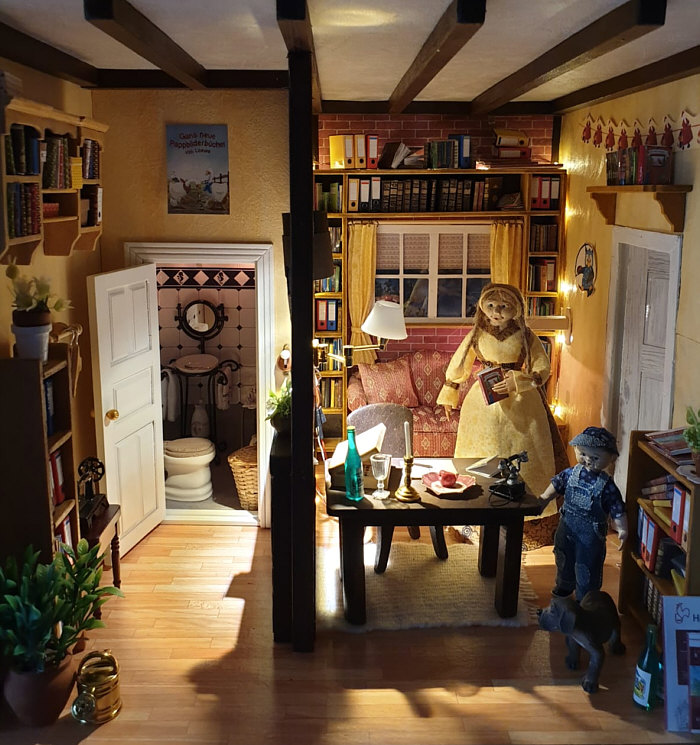 Ihr erinnert Euch sicher ... es ist schon zwei Jahre hier, da gab es diese Bilder im Kalenderblatt: ![]() ![]() ![]() ![]() ... einen Tag später gings so weiter: Gestern haben wir schon ein bißchen durch Fenster und Türen schauen dürfen, heute zeige ich Euch alles :)). ![]() ![]() ![]() ![]() ![]() ![]() Erneut einen Tag später gab es diese Bilder: Ihr könnt Euch doch ganz sicher noch an dieses ... ![]() ... Puppenhaus erinnern ... ich hab Euch immer noch nicht gesagt, wer das Haus gebaut hat ... dabei ist die Person sogar fast prominent. Aber auch heute sage ichs noch nicht ... aber das nächste Mal. Es geht weiter mit dem Puppenhaus ... wie, das ist doch fertig und komplett ? Ja ... aber ... das Haus steht auf einem Schrank ... ![]() ... und dort sind vier Fächer drin ... die werden auch noch eingerichtet. Oben rechts ist schon fertig ... und wir dürfen heute gucken :)). Und zwar Schritt für Schritt ... es begann ... ![]() ... mit viel Karton und Schere ... ![]() ... und dann kamen Ausdrucke dazu und Kleber. Viele kleine Bücher entstehen so ... ![]() ... ganz echt aussehende Miniaturbücher: ![]() Was könnte also in dem neuen Zimmer zu sehen sein ? Richtig ... eine kleine Hausbibliothek ... und nun Tusch ... ich zeige sie in ganz groß: ![]() Und kurz darauf zogen schon die ersten Bewohner ein: ![]() ![]() Einen weiteren Tag später zeigte ich ein Video, dass alles erklärt: Dieses Video unbedingt nochmal schauen ... und Euch auf morgen vorfreuen :)). |
