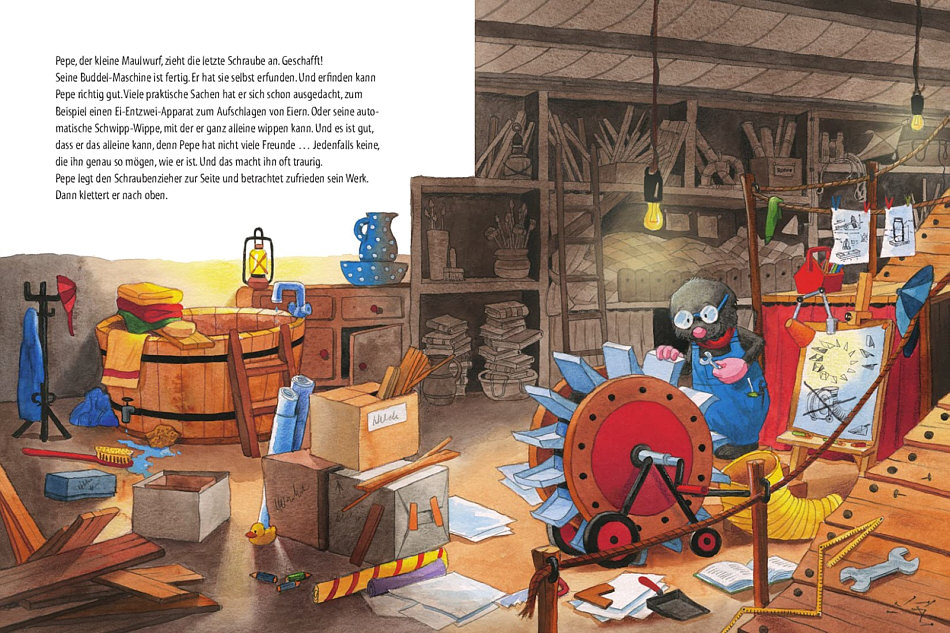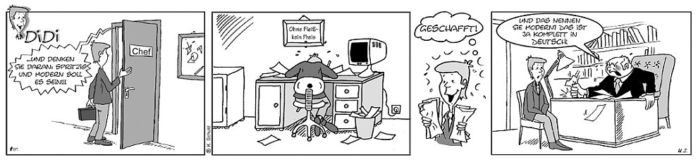 Leute ... eine Woche geht bis Samstag. Zumindest die Werktage. Und da es in den letzten Tagen ja quasi ums "Werken" ging, muss die Kerstin-Woche natürlich auch bis Samstag gehen :). Denn die Kerstin ist ja nicht hauptberuflich Bastlerin von Puppenhäusern, Wichteltüren und Book Nooks. Aber als allererstes muss ich mich mal bei Juttinchen bedanken ... denn ohne sie hätte ich Kerstins Werke nie zeigen können. Juttinchen kennt Kerstin, war bei ihr in der Wohnung und so begeistert, das sie mir damals vom Puppenhaus und jetzt von den Book Nooks erzählt hat. Und so kam der Stein ins Rollen. Ich hätte das alles ja ganz anders aufziehen können ... ich hätte sagen können: Hey, ich kenn da jemanden, der ist berühmt. Und hey, der zeigt das, was er privat macht, auf Seelenfarben. Doch ich wollte einfach die Kunstwerke wie Wichteltüren, Book Nooks und das Puppenhaus für sich erzählen lassen. Denn berühmter als mit solchen Kunstwerken kann man auf Seelenfarben gar nicht werden. Aber außerhalb von Seelenfarben ist Kerstin bei vielen Menschen bekannt. Mit ganzem Namen Kerstin M. Schuld. ![]() Sie ist Kinderbuchillustratorin. Für Verlage wie Ravensburger, Coppenrath, und Ars-Edition und viele mehr. Ich sag mal ein paar Kinderbuchtitel: "Billy Bär, mein bester Freund" "Michel und die kleine Leni" "Pommes und Majo - Gemeinsam sind wir rattenstark" "Die Regenbogenreise" Aktuell ganz besonders beliebt und bekannt sind diese Titel: ![]() ![]() ![]() Das sind nicht einfach nur Bücher ... tiptoi® ist ein Lern- und Kreativsystem, mit dem Kinder die Welt spielerisch entdecken. Da gehört ein Stift dabei ... tippt das Kind mit dem Stift auf ein Bild oder einen Text, erklingen passende Geräusche, Sprache oder Musik. Der Stift muss zwar extra gekauft werden, aber wenn das Kind einen solchen einmal hat, kann man die Software jedes tiptoi Buches dort aufspielen. Auf der ersten Seite befindet sich jeweils ein Button. Tippt man ihn mit dem Stift an, "weiß" der Stift, um welches Buch es sich handelt und spielt die dazugehörigen Audiodateien ab. So viel zur neuen tollen Technik von Kinderbüchern. Alle Illustrationen in diesen Büchern sind von Kerstin. Kommen wir zu diesem Buch ... ![]() ... hier ist nicht nur die Illustration, sondern auch der gesamte Text des Buches von ihr: ![]() So entstehen Zeichnungen ... zuerst ist es ein Entwurf ... ![]() ... daraus entsteht dann das fertige Buch-Cover: ![]() Ein weiteres Beispiel: ![]() ![]() Auch bei Pepe stammen alle Zeichnungen und alle Texte von Kerstin: ![]() ![]() Zwei weitere Beispiele: ![]() ![]() Hach ... man müsste nochmal Kind sein ... dann könnte man ... ![]() ... Bücher "mit Pustelicht" lesen. Kerstin malt übrigens mit verschiedenen Techniken ... Gouache, Aquarell, Collage, Stil-Experimente. Hier noch ein etwas älteres Buch in einem etwas anderen Stil, hier kann ich sogar zwei Doppelseiten des Buches zeigen: ![]() ![]() ![]() Eigentlich müsste ich jetzt aufhören ... ein Regenbogen wäre ja das perfekte Schlußbild für das Seelenfarben-Kalenderblatt ... mehr Farben geht ja nicht. Aber ich kann nicht aufhören ... noch nicht. Eine Zugabe ... mindestens ... lächel ... hätte ich noch ... Kerstin sagt: "Eine Zeit lang war ich für die Sprachzeitung "Deutsche Sprachwelt" als Karikaturistin tätig. Hier entstand die "Didi"-Reihe." ![]() So ... das wars. Nee ... sorry ... nicht bei Kerstin ... denn sie ... ... dichtet auch noch: Die Fliege Flü Fliege Flü, ein Fliegenkind, ist so, wie Fliegenkinder sind, und macht vor lauter Übermut oft Dinge, die tun gar nicht gut. So wie an diesem Sommertag, die Sonne scheint, wie‘s Flü gern mag, als sie herumfliegt, eventuell ‘ne Klitzekleinigkeit zu schnell. Achtung! Da, der Tisch! Ganz dicht! Herrje, sie kriegt die Kurve nicht! Da klatscht sie schon ans Wasserglas und rutscht hinab ins kühle Nass. „Hilfe!“, ruft sie im Versinken, einmal kann sie grad noch winken, alles dreht sich, rauf und runter, dann macht es blubb und sie geht unter. Um es mal ganz klar zu sagen: ihr letztes Stündlein hat geschlagen. Doch im letzten Augenblick hat Fliege Flü ein Riesenglück! „Warte“, ruft Klein-Barbara, die Flü, die Fliege, sinken sah und rettet sie, mal eben so, mit einem Kletterhalm aus Stroh. „Was ein Glück!“, schnauft da die Flü, erklimmt den Halm nicht ohne Müh‘ und brummt: „Bei über dreißig Grad geht eben nichts über ein Bad!“ © Kerstin M. Schuld Glatt vertanzt Heute möchte ich berichten, dies ist die erste der Geschichten, was man beim Line Dance ab und an auf Partys so erleben kann. Auf einer solchen war das so: ich sitz‘ am Tisch, vergnügt und froh, und warte, wie hier jedermann, dass was gespielt wird, das ich kann. „Ja, genau, den hab ich drauf!“, ruf ich dann und springe auf, doch es schwant mir unterdessen: den Anfang hab‘ ich glatt vergessen! Mein Blick, der wandert sorgenschwer von links nach rechts schnell hin und her. Wer könnte helfen in der Not? Vielleicht der Typ dort, der mit Hut? Ja, der sieht aus, als ob er’s kann. Ich frag‘ ihn: „Wie fängt der denn an?“ Die Antwort ist ein Achselzucken: „Das wollt‘ ich grad bei Dir abgucken.“ Oh je! Jedoch, was nützt die Klage? Rechts oder links ist hier die Frage! Ich hör‘s, gleich startet das Getanze … Alles klar - ich geh auf’s Ganze. Ein Schritt nach rechts mit viel Courage, was folgt ist ‘ne Karambolage, so doll, dass beinah‘ einer fällt- der Typ mit Hut hat links gewählt. Völlig aus dem Takt gekommen erkenne ich noch ganz benommen, taumelnd, beinah‘ wie besoffen: er hat die richt'ge Wahl getroffen! Tu dich auf, Loch in der Erde, auf dass unsichtbar ich werde! Doch der Typ brummt ganz versöhnlich: „Macht nix, ich nehm’s nicht persönlich.“ Wir reihen uns flugs wieder ein und tanzen beide in der Line exakt synchron und ganz behende das Tänzchen fehlerfrei zu Ende. © Kerstin M. Schuld So, das wars nun wirklich ... hab ich was vergessen ? Mit Sicherheit ... doch es gibt j