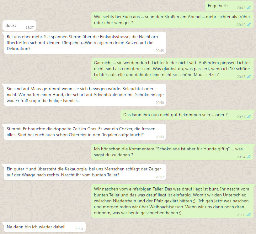 spontane Zwiegespräche im Advent Die Gespräche finden in diesem Jahr ganz spontan per Whatsapp statt. Erst 2-3 Tage vor dem Kalendertürchen. weiter