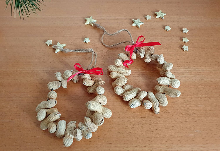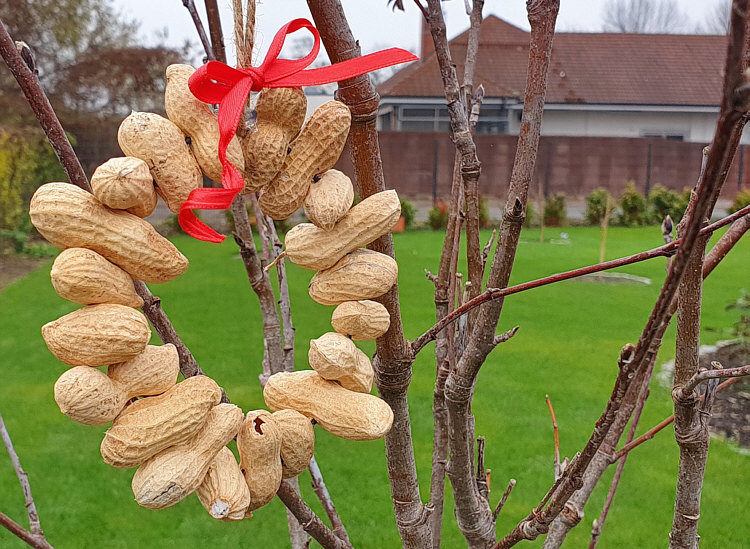 Für die Vögel und Eichhörnchen hat Elfi Draht zu Ringen geformt und darauf Erdnüsse gefädelt. Mit einer kleinen roten Schleife versehen hängen sie jetzt am Baum im Garten. weiter