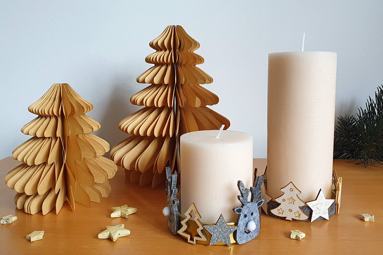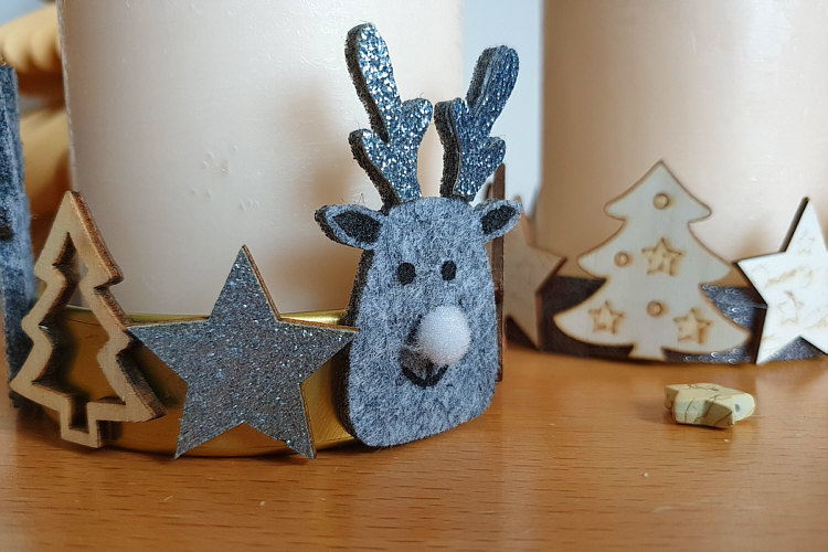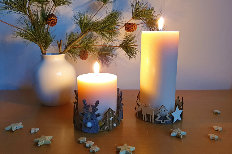 Deckel von z. Bsp. Honiggläsern wurden hier mit Streudekoteilen beklebt und dienen somit als Untersetzer für größere Kerzen. weiter