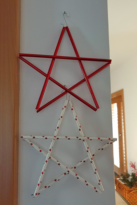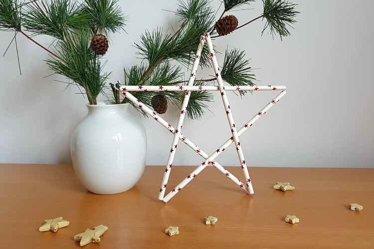 Aus Papiertrinkhalmen sind diese Sterne entstanden. Dafür 5 Halme nacheinander auf eine Schnur fädeln, zur Runde schließen und zum Stern formen. weiter
