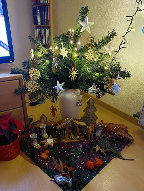6. Wird es bei Dir/Euch in diesem Jahr einen Weihnachtsbaum geben ? In meiner Wohnung habe ich keinen Platz für einen Tannenbaum, aber ich kaufe mir immer Tannenzweige, die ich in eine Vase stelle und schmücke. Den Tannenbaum kann man bei meinen Eltern draußen geschmückt sehen. |