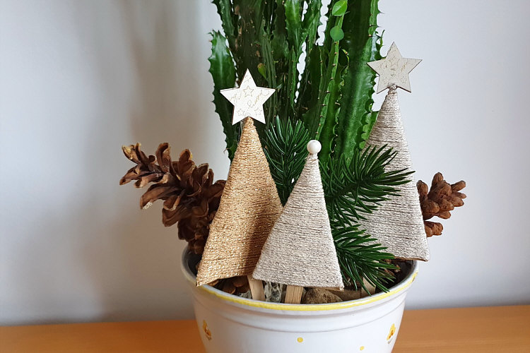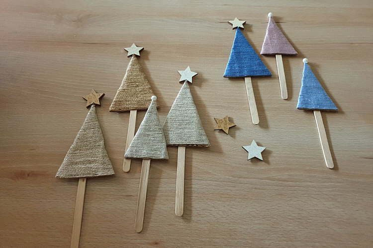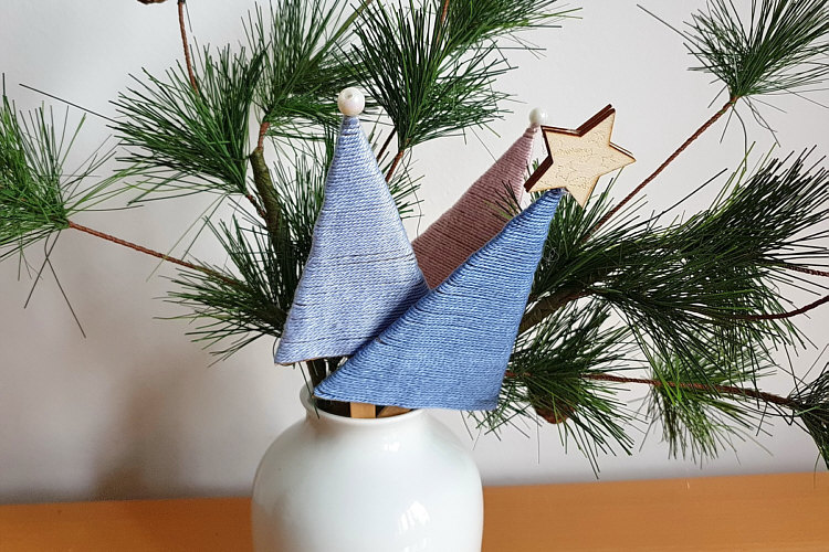 Sie wurden mit Wollresten und Glitzergarn umwickelt und mit einem Dekostern oder