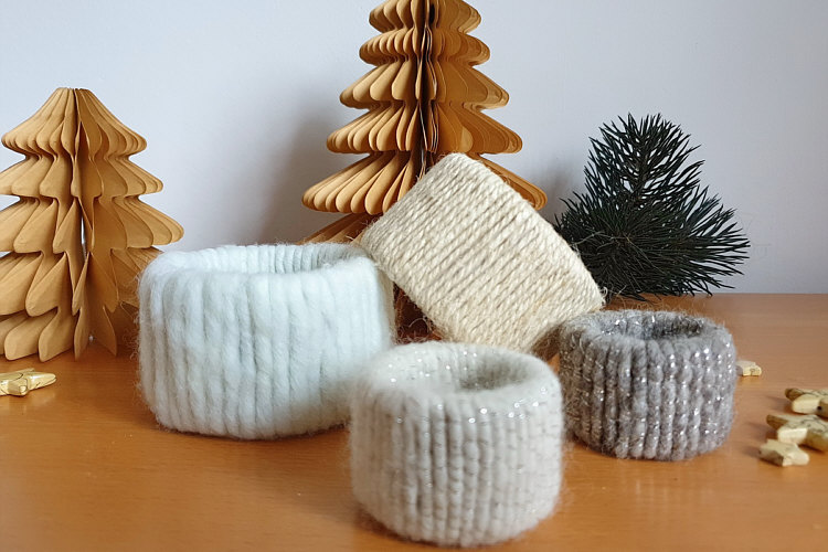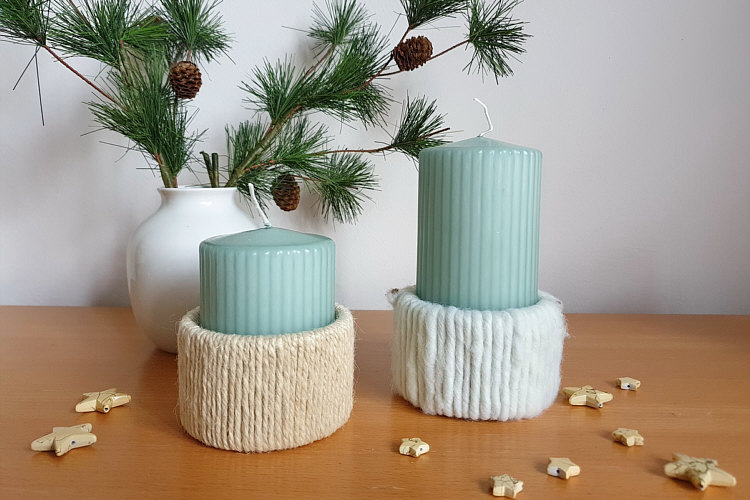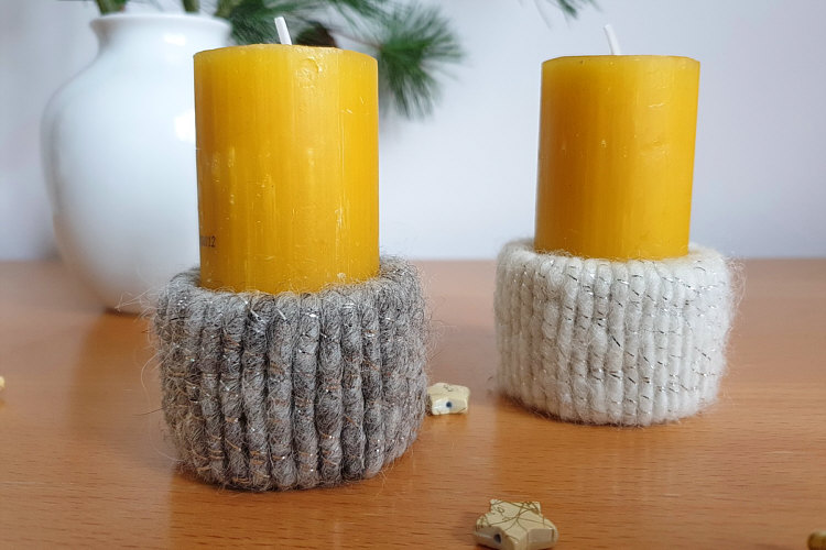 Elfi schreibt: "Die Papprollen von z. Bsp. Paketklebeband habe ich hier mit verschiedenen Schnüren umwickelt. Sie dienen als Manschette für größere Kerzen." weiter
