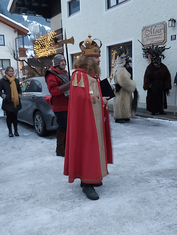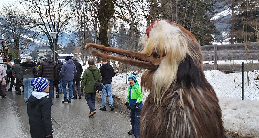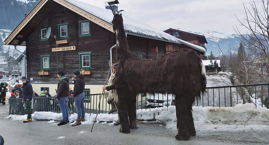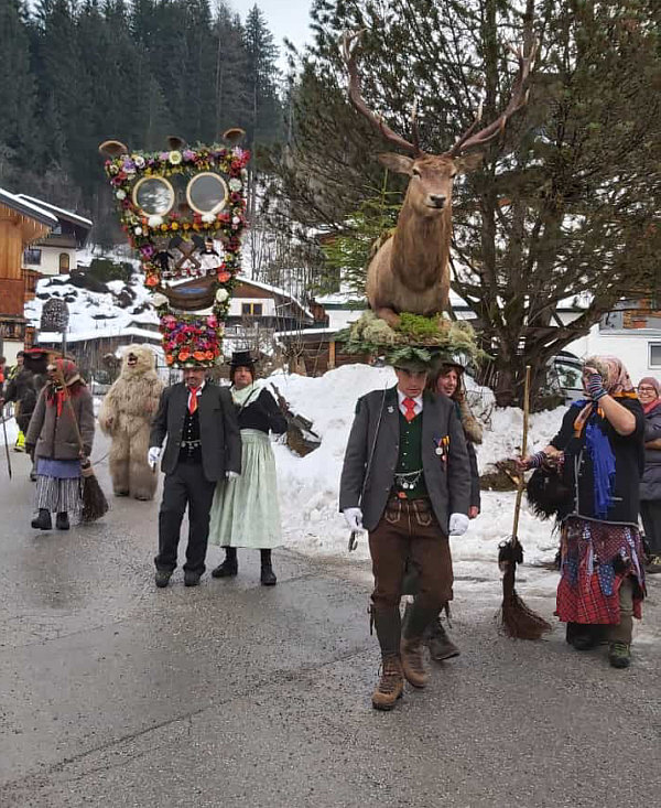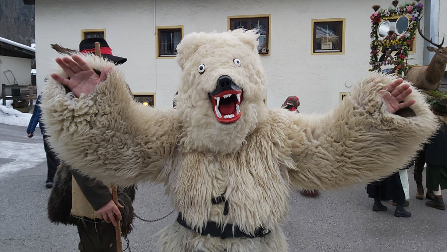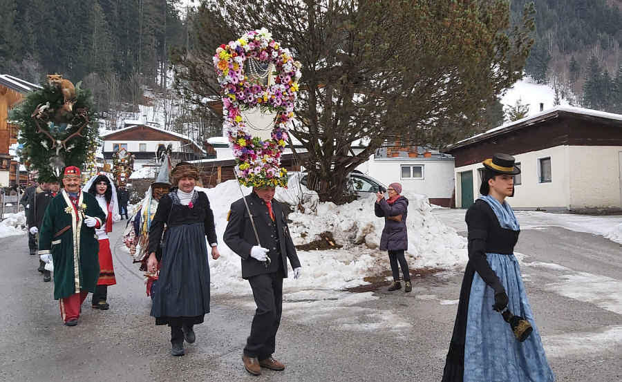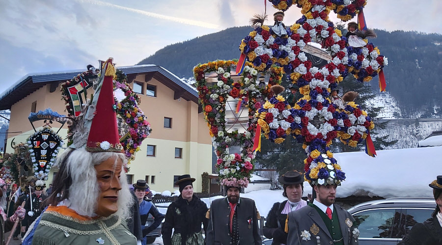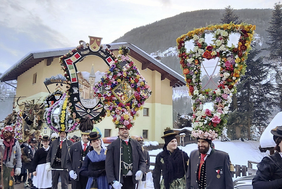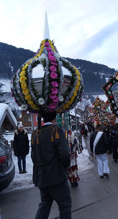 Was hältst du davon: Etwas, das 25-50 Kilo wiegt, auf dem Kopf tragen und damit in 10 Stunden 13 Kilometer laufen. Wie ... höre ich da ein "bist wohl wahnsinnig" ? Oder "hast schlecht geschlafen" ... oder "träumst gerade" ? Nein, ich bin ganz wach ... denn ich sehe gerade dieses Bild: ![]() Das ist alles Realität ... gestern im Gasteinertal. Fotografiert von Christine B. Dort gibt es seit dem 14. Jahrhundert eine Tradition, die sich "Perchtenlauf" nennt. Alle vier Jahre startet dieser Lauf. Perchten sind weibliche Masken- und Sagengestalten, die in den Wintermonaten auftreten. Über 140 Personen machen beim Lauf mit, 30 Kappenträger sind dabei. Die Figuren versinnbildlichen alle möglichen Geister und Dämonen, an die die Menschen immer glaubten. Ein Percht ist eine Gestalt des alpenländischen Brauchtums ... es gibt zwei Gruppen: die "Schönperchten" und die "Schiachperchten". Das ist die "Frau Perchta", hier gibt es Schön und schiach in einer Person. ![]() Vorne ist sie schön ![]() Hinten ist sie schiach Frau Perchta zeigt das Gute und Böse im Menschen in einer Figur. Ein schönes, freundliches Frauengesicht auf der Vorderseite, ein fratzenhaftes, furchterregendes Gesicht auf der Rückseite. Sie geht freundlich auf umstehende Personen zu, reicht die Hand und dreht sich dann ganz schnell um und zeigt ihr anderes Wesen. Die Schönperchten (die mit den Blumenspiegeln auf den Köpfen) begrüßen den Frühling, die Schiachperchten treiben den Winter aus. ![]() König Herodes läuft auch mit und hier sieht man rechts im Bild eine Schiachperch. Auch die Kramperl gehören dazu: ![]() Beim Perchtenlauf machen nur Männer, teilweise als Frauen verkleidet, mit. ![]() ![]() Früher hatten die Menschen Angst vor den langen dunklen Nächten und ihren Dämonen ... ... die Spiegel zwischen den Blumen sind dazu da, dass die Dämonen dort reinschauen und sehen, wie hässlich sie selbst sind und das Weite suchen. Alle Schönperchten tragen weiße Handschuhe und einen Säbel. Kommen sie vor ein Haus, tanzen sie und verbeugen sich dann. Mit den Schmuck auf dem Kopf. Damit nix passiert, steht ein als Frau verkleideter Mann daneben und hilft den Kopfschmuck wieder hochzuheben. Ich darf vorstellen ... den Zwiebelturm ... ![]() ... und die Heiligen Drei Könige und der Sternträger : ![]() ![]() Eine Schnabelpercht ist auch dabei ... ![]() ... und das ist die Habergeiss: ![]() Ein Bärentreiber mit zwei Bären ist auch dabei ... hier ist einer davon ... ![]() ... die Bären symbolisieren die Macht des Winters und der bösen Elemente, welche aber vom Bärentreiber unter Kontrolle gehalten werden. Im Perchtenzug gehen der Treiber und seine zwei Bären nach den Kappenträgern, um nachdrängenden Zuschauern den Weg zu versperren. Die Bären heißen Teddy und Ursus. So ... und nun können wir live dabei sein beim 2018er Lauf: Hier gibts weitere Infos zu den einzelnen Figuren. |
