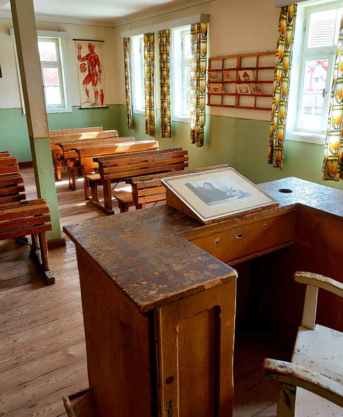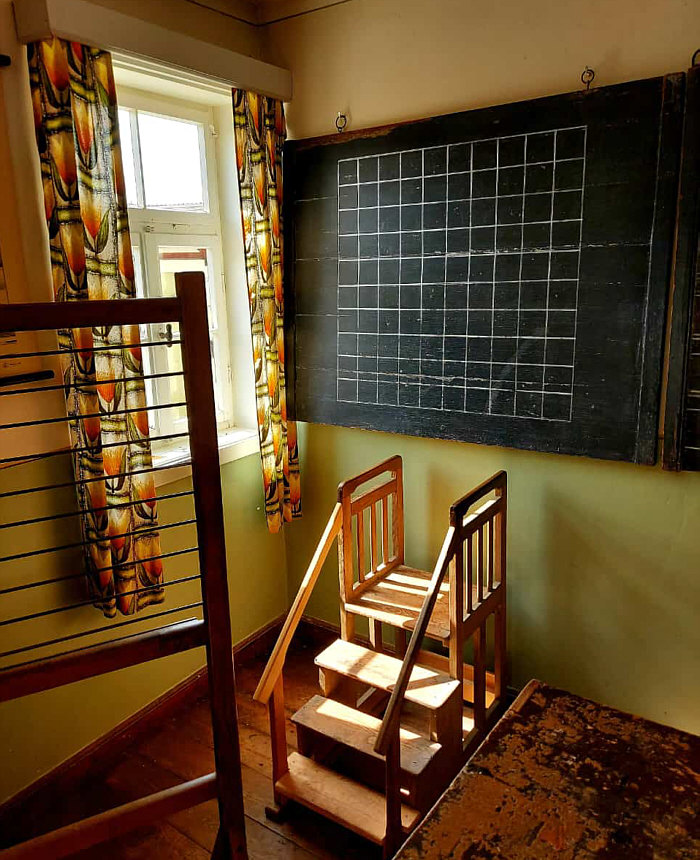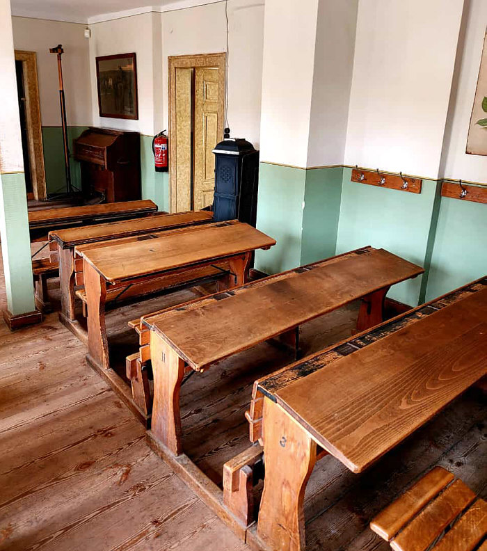 Von den Kalenderblättern, die ich noch zeigen will ... ... zeige ich heute ... 3 - quietscht ... und was mag denn da quietschen ? Reifen ? Tür ? Leder ? Nein ... Kreide ... die quietscht an der Tafel. Wir sind heute im kleinen Ort Hohenfelden (weniger als 400 Einwohner) und dort gab es Anfang der 50er Jahre eine "Einklassenschule". Zur Erklärung "Die Einklassenschule, auch als Zwergschule, ist eine Schulform im ländlichen Raum. Einklassenschulen umfassen bzw. umfassten je nach Schulsystem fünf bis acht Jahrgangsklassen der Volksschule. Alle Kinder werden von nur einer Lehrperson in zumeist einem, bei besserer Ausstattung auch zwei Räumen unterrichtet". Heute gibt es nur noch vereinzelt Einklassenschulen, beispielsweise auf den nordfriesischen Halligen Hooge, Langeneß, Gröde und Nordstrandischmoor". Und damals eben in Hohenfelden ... Schüler von 6-14 Jahren besuchten damals diese Schule, die heute als Museum erhalten geblieben ist. Sywe war dort und hat uns Bilder vom Klassenraum mitgebracht: ![]() ![]() ![]() Die Einklassenschule bestand bis Anfang der 50er Jahre. Neben dem Schulraum gab es noch ein Lehrerzimmer und dort lagerten die Unterrichtsmaterialien - Landkarten, Globus, Skelett etc. . Und es gab eine Dienstwohnung ... die war im Obergeschoss und bestand aus zwei Räumen plus Küche. Ein Bad gab es nicht. Im Erdgeschoss war eine Waschküche mit Kessel und ein Plumpsklo. In die Dienstwohnung dürfen wir auch mal reinschauen: ![]() ![]() ![]() Heute dürfen wir eine kleine Zeitreise machen und so manches uns sehr bekannte Detail wiederentdecken. |