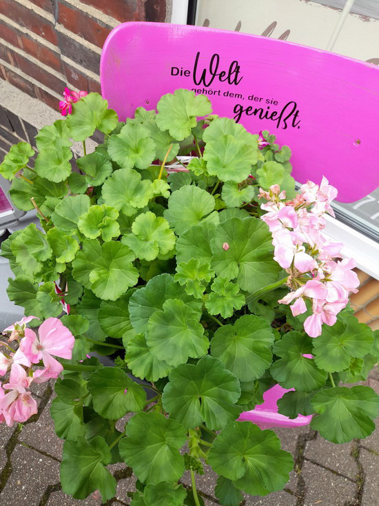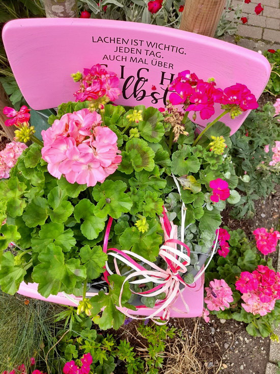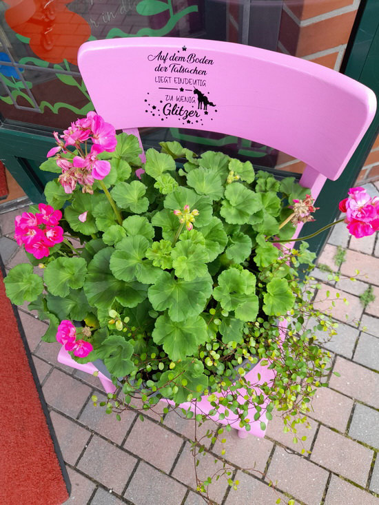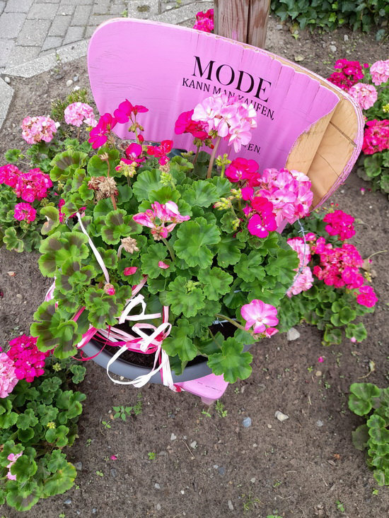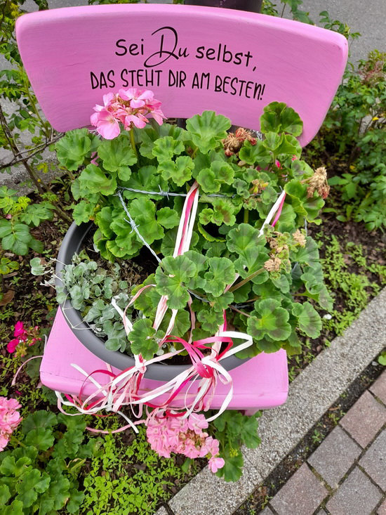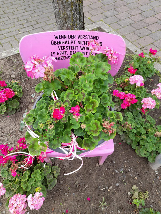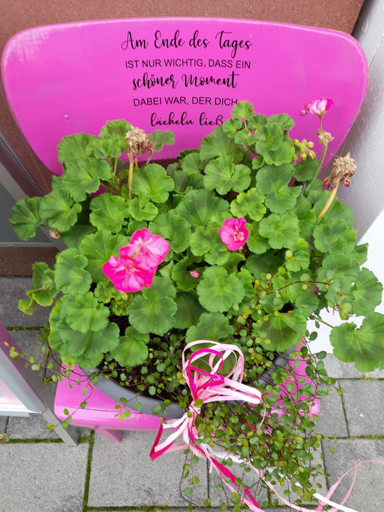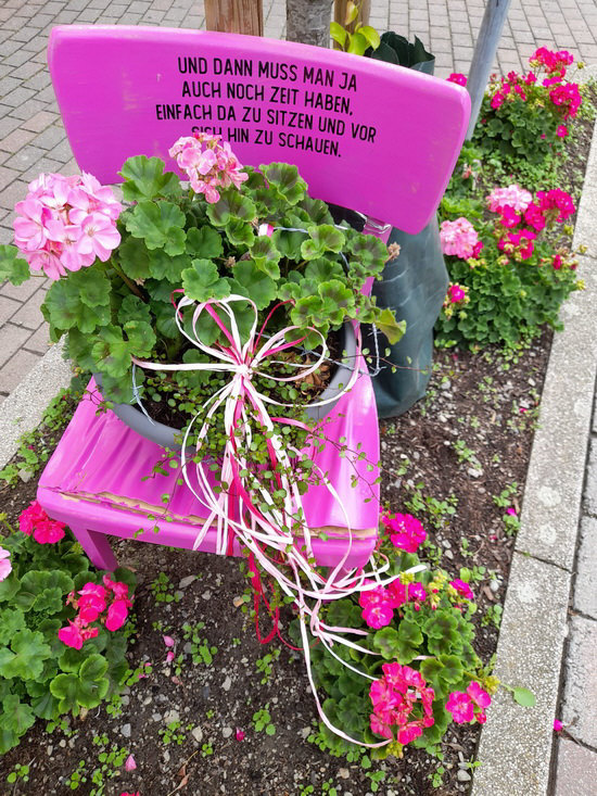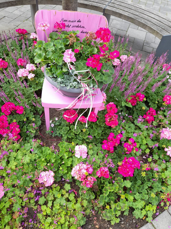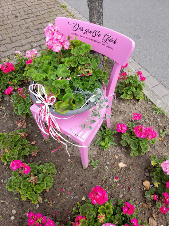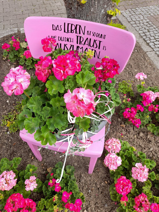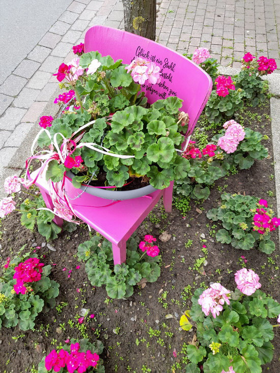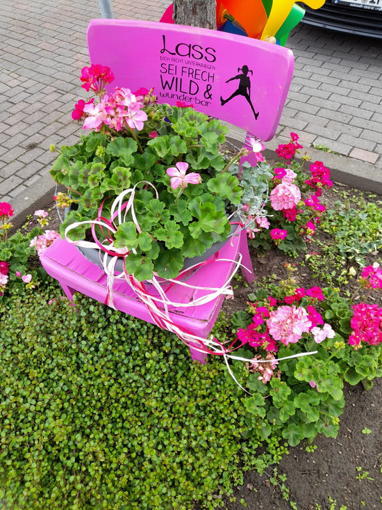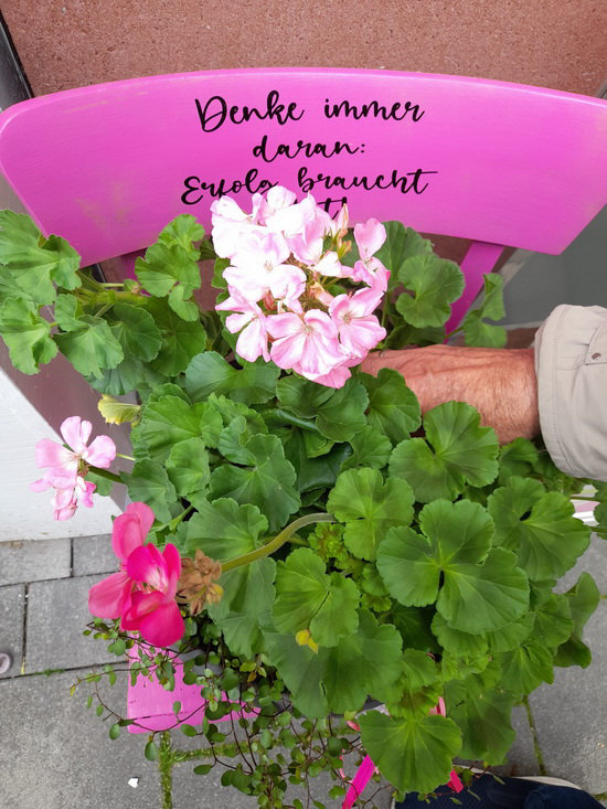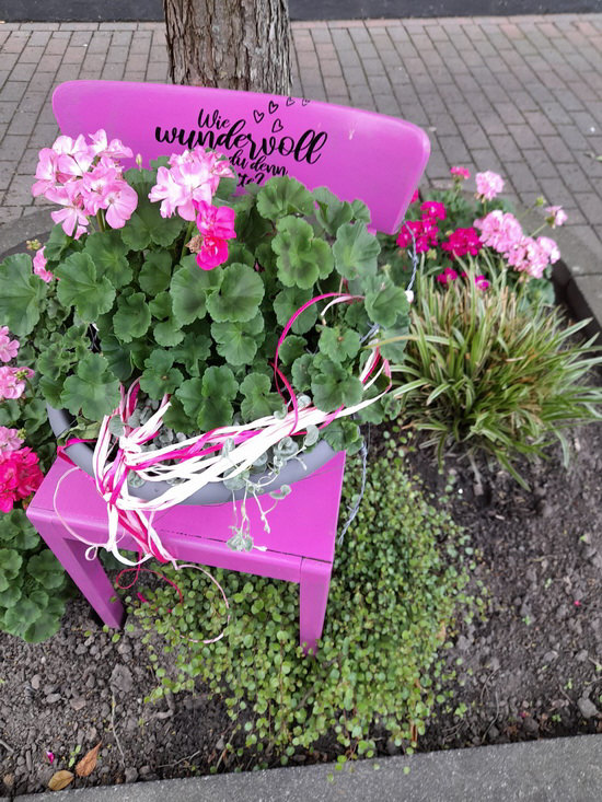 und hat die Stadt mit Stühlen, Sprüchen und Blumen geschmückt.