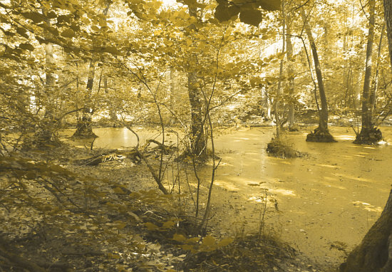 In sumpfig braun bis rötlichem Bachwasser schwammen Molche,