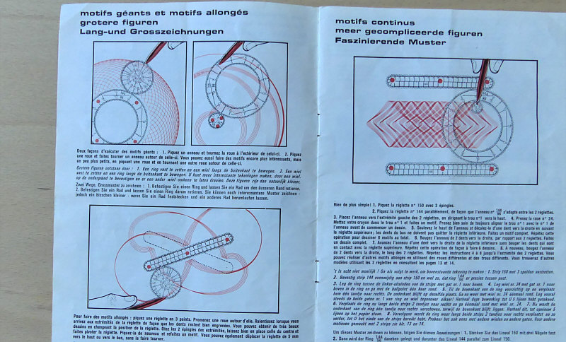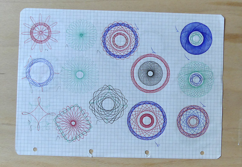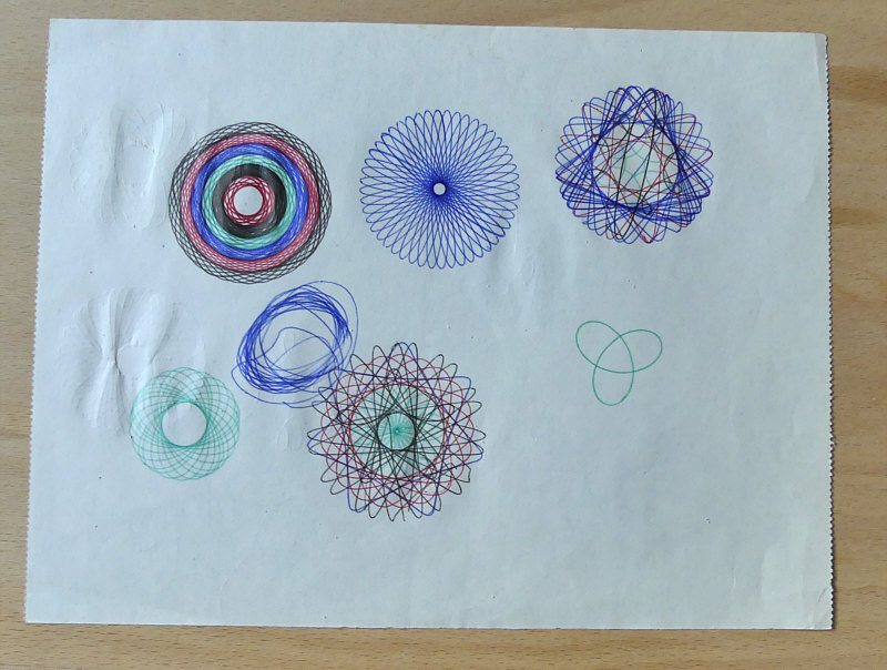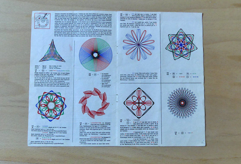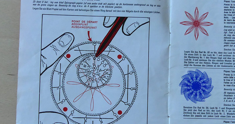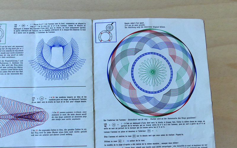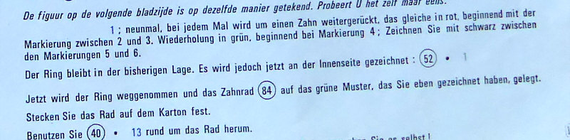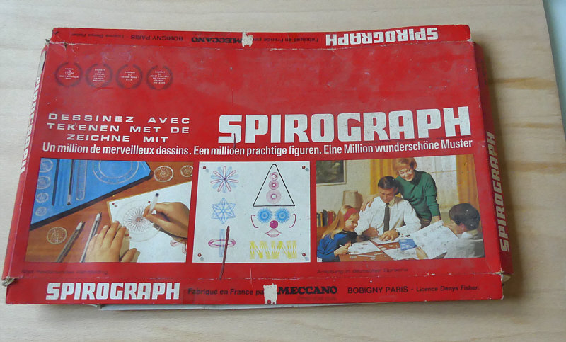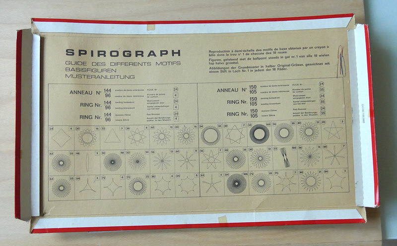 Im berühmten Keller ... wo dies und das und jenes liegt ... ... habe ich auch das gefunden: ![]() Ziemlich zerfleddert ... ![]() ... und in dem Plastikdingens ... ![]() ... ist nix mehr drin ... weil alle Räder lose rumfliegen ... ![]() ... hey, das könnte fast ein Bild von Kandinsky sein ;). Die Räder sind nicht mehr komplett, wie es aussieht ... aber das Anleitungsheft ist noch da: ![]() ... da kann man sehen, wie das damals gemacht wurde. Den Stift in ein kleines Loch stecken und dann am Rande des Zahnrades entlang fahren. So entstehen kleine Wunderwerke ... ![]() ... und überall steht genau dabei, was man wie machen muss. Manches ist einfacher, manches komplizierter, manches geht schneller, manches dauert länger. Meistens malt man mit dem Stift in einer kleinen Scheibe innerhalb des großen Kreises ... aber es gibt auch Ausnahmen: ![]() Und dann das ... in der Packung liegt auch ein Stoß Blätter ... ![]() ... wie ich gestern erst gesehen habe. Und ich glaubs fast nicht ... dort sind alle gezeichneten Werke zu finden. Weiß nicht, ob die alle von mir waren ... glaub eher nicht, denn auch meine Mama hat gerne mit dem Spirograph gemalt. Auf den Blättern ist alles mögliche zu finden ... von den ersten Anfängen ... ![]() ![]() ... bis zu immer besser werdenden Zeichenobjekten. ![]() Wir haben richtig viel gemalt ... das war für eine kurze Zeit der Freizeithit gewesen. ![]() ![]() ![]() Auf dem Bild sind auch Haken zu sehen ... da haben wir dann eine Zeichnung nach dem Vorlagenheft nachgemalt und es scheint geklappt zu haben. Abgehakt also ;). ![]() Vorder- und Rückseiten wurden bemalt ... ![]() ... und ein paar einzelne Mandalas (oder wie man das nennen mag) zeige ich extra: ![]() ![]() ![]() ![]() ![]() ![]() Eine der größten Zeichnungen ist der Kreis rechts im Vorlagenheft ... ![]() ... und das ist die Anleitung dazu: ![]() ![]() Und ... kaum zu glauben ... auch dieses Kunstwerk findet man auf den Blättern: ![]() Lang lang ists her ... |
