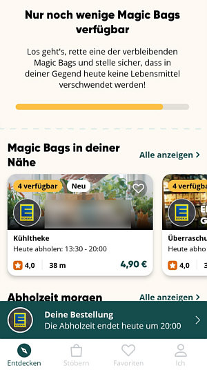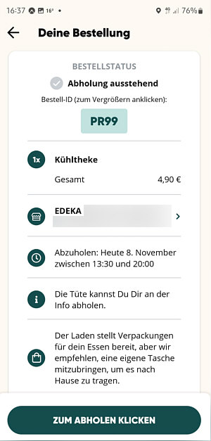 Ich habe ![]() getestet. Too Good to go sagt über sich: ![]() Wikipedia sagt: "Too Good To Go ist eine Mobile App, die Kunden mit Restaurants und Geschäften verbindet, die unverkaufte, überschüssige Lebensmittel haben und diese zu einem vergünstigten Preis an Selbstabholer verkaufen. So müssen Restaurants, Cafés, Supermärkte und Hotels Lebensmittel, die noch gut sind, nicht als Food Waste entsorgen." Warum habe ich das getestet ? Vor allem, weil ich neugierig bin. Mich hat das sehr interessiert, rauszufinden, wie sinnvoll das ist. Wobei ein einziges oder erstes Mal nicht generell aussagekräftig ist. Aber man muss halt mal anfangen. Auf dem Handy sah das so aus: ![]() Da wo "4 verfügbar" steht, stand eben noch "5 verfügbar", weil ich einen "Magic Bag" gekauft hatte ... ... unten steht, dass ich den bis 20 Uhr abholen muss. Dort im Supermarkt musste ich dann das zeigen ... ![]() ... woraufhin eine Mitarbeiterin ins Kühlhaus ging und mir einen Magic Bag brachte. Ich habe noch im Geschäft nachgerechnet ... ja, es stimmt, in der Tasche sind Waren von mindestens 14,90 Euro Wert drin. Ich musste dafür nur 4,90 bezahlen. Weil die Waren in etwa am gleichen (oder vorigen oder nächsten) Tag ablaufen. Der Markt ist 14 km entfernt ... wir haben das mit einem Spaziergang im Nachbarort des Marktes verbunden. Dies war in dem Magic Bag drin: ![]() Da würde ich jetzt sehr gerne Eure Meinung dazu hören. Meine schreibe ich gegen Abend ins Tagebuch. |