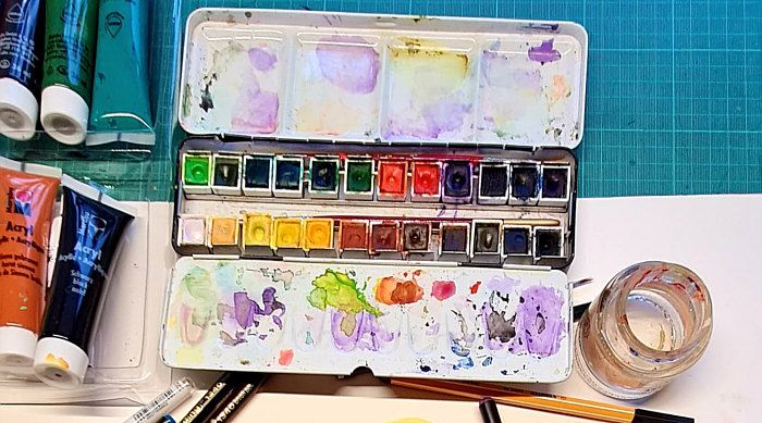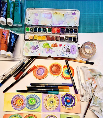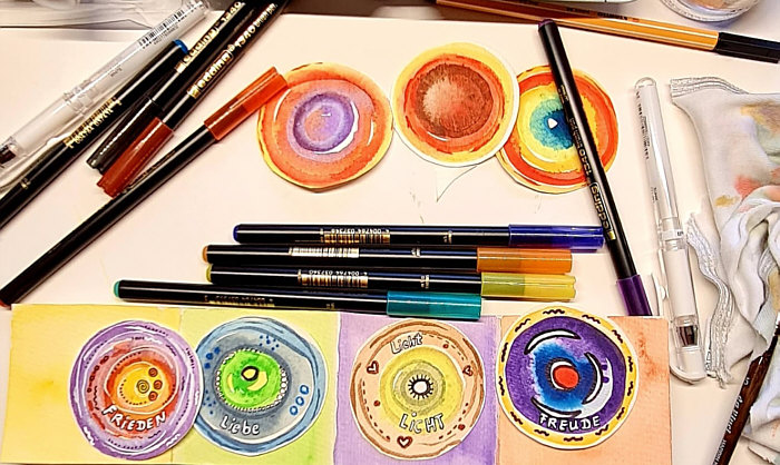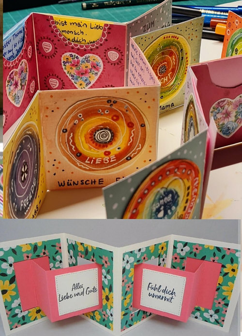 ![]() Heute wirds richtig seelenfarbig her ... vorher muss ich erklären, was ein Leporello ist: ![]() Der oder das Leporello, auch Faltbuch genannt, ist ein faltbares Heft in Form eines langen Papier- oder Kartonstreifens, der ziehharmonikaartig zusammengelegt ist. Es wird vor allem für Foto- und Bilderserien, Faltblätter und Prospekte verwendet. Oder für kreative Dinge, wie das Seelenfärblerin Christa Borns macht: ![]() Oben ist der Malkasten ... ![]() ... und darunter sieht man erste Kreise ... ![]() ... und vier davon liegen auf einem Stück Karton und warten darauf, drauf geklebt und gefaltet zu werden. Christa schreibt dazu: "Ich liebe Leporellos - besonders als Miniaturen. Diese kleinen gefalteten Bücher bieten die Möglichkeit für sehr individuelle Geschenke, Glückwünsche. Zur Zeit gestalte ich Leporellos in der Manier von Happy Painting, habe aber auch schon Fotos eingeklebt und kleine Taschen, in denen ich Briefe verstecke oder Geldscheine, was auch immer ... unbegrenzte Möglichkeiten." Diese Happy-Painting-Motive zeige ich Euch heute: ![]() ![]() ![]() ![]() ![]() ![]() ![]() ![]() ![]() ![]() ![]() ![]() ![]() So sehen die Leporellos dann fertig aus: ![]() |