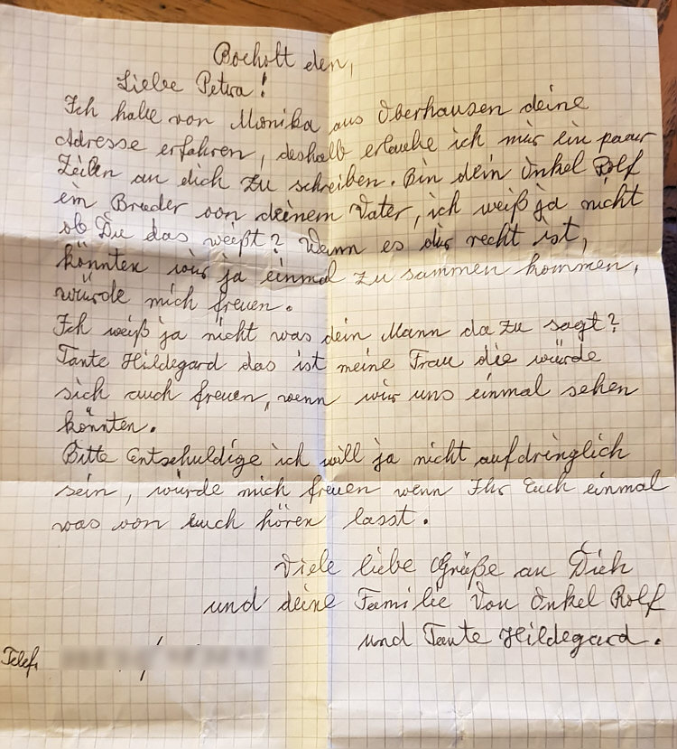 ![]() Diesen Brief ... ![]() ... schrieb Onkel Rolf an Petra B. Das war ca. 1989 ... Petra war gerade in den Westen gekommen, der Onkel wohnte dort schon immer oder länger ... aber, wie man aus dem Brief lesen kann, es gab bisher keinen Kontakt. Und das sollte auch so bleiben ... trotz des Briefes. Petra (die mittlerweile im Ahrtal wohnt) hat diesen Brief nämlich ... ![]() ... 2022 ... also 33 Jahre später ... beim Ausräumen ihres Hauses gefunden. Ohne eine Erinnerung daran zu haben, dass ein solcher Brief je existiert hat. Was nun ? ![]() Die Nummer im Brief führt nicht zu einem "Onkel Rolf" am anderen Ende der Leitung. Die Frage "was nun" wird 2022 ja fast immer mit "Internet" beantwortet. Genau ... Petra recherchiert nach dem Namen des Onkels im Internet. Sie stößt auf einen Artikel über eine Vogelzüchterverein, in dem Onkel Rolf erwähnt wird, ohne allerdings abgebildet zu sein. Petra mailt den Vorsitzenden des Vereins an ... der weiß von einem Rolf mit diesem Nachnamen nichts, aber von einem Günter, der diesen Nachnamen hat. Und irgendwann läutet bei Petra das Telefon und Günter war dran. Es stellt sich raus, dass Günter der Stiefsohn von Onkel Rolf ist. Und Onkel Rolf und Tante Hildegard ? Die Tante ist leider schon tot ... aber der Onkel lebt. Er lebt 33 Jahre nach dem Brief immer noch ... 92 Jahre ist er inzwischen alt. Es kam, wie es kommt, wenn alles gut geht ... vor ein paar Tagen kam ein Auto bei Petra vorbei ... der Enkel am Steuer und Opa Rolf im Auto. Petra ist 67, der Onkel 92 ... beide haben sich noch nie gesehen ... ... bis zu diesem Tag ... den ein wiedergefundener Brief und das Internet möglich gemacht haben :)). |