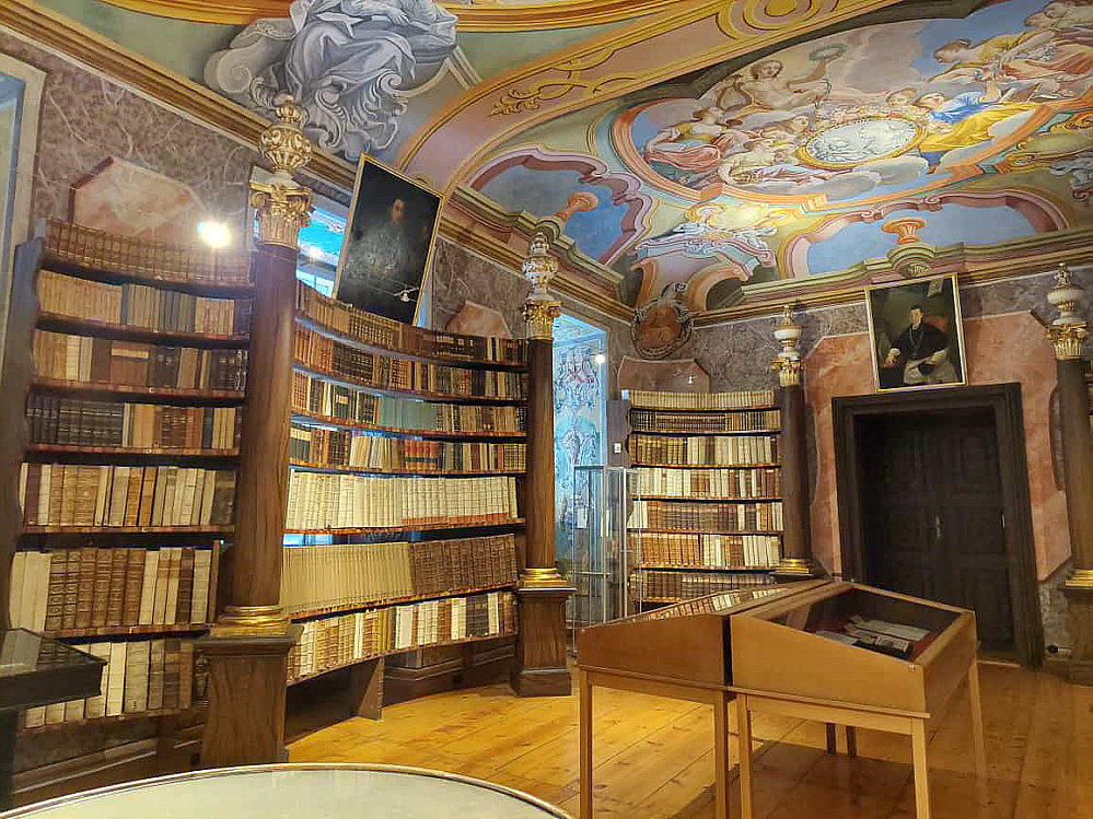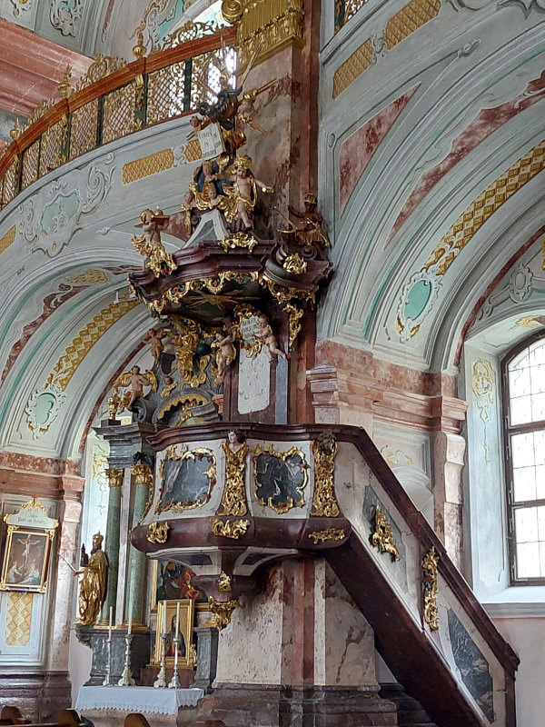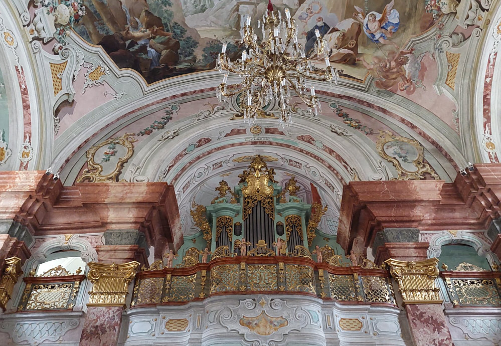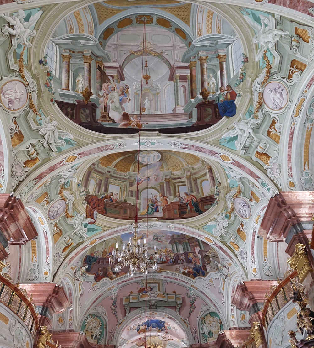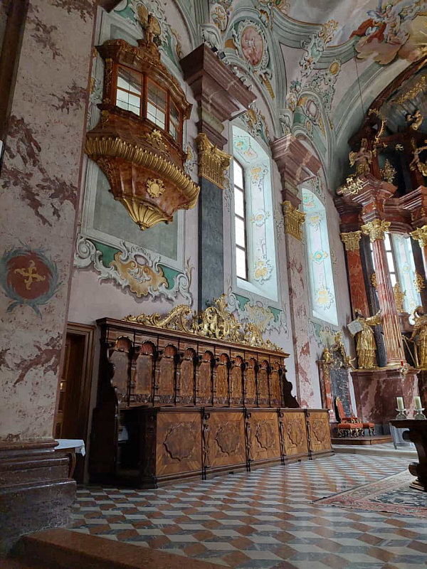 Das verbindet sich heute wunderbar ... zum einen, dass ich nochmal Seelenfärbler-Bilder zeigen will und zum anderen, dass es gestern keine klassische Sonntagskirche gab. Und so kommt eines zum anderen ... denn Lina war im Stift Rein in der Steiermark in der Nähe von Graz. Und sie hat uns Bilder mitgebracht (die ich teilweise mit Wikipedia-Bildern ergänze). ![]() Stift Rein ist das älteste bestehende Zistersienserstift der Welt. ![]() Eine ganz besondere Rolle spielt dabei die ursprünglich romanische Stiftskirche, die später barockisiert wurde. ![]() Außen an der Fassade begrüßt uns der heilige Bernhard von Clairvaux: ![]() Und das da ... ebenfalls außen an der Fassade ... ![]() ... ist ein "Hornwerk". Das Hornwerk ist ein mechanisches Orgelinstrument. Es bestand in seiner ursprünglichen Form nur aus Windkasten, Blasebalg und Pfeifen, die bei Betätigung des Blasebalges einen vielfach verstärkten Dreiklang erzeugten. Im Mittelalter wurden solche Instrumente in die Befestigungsanlagen von Städten und Klöstern in spezielle Horntürme eingebaut. Sie erfüllten einer Sirene vergleichbare Signalfunktionen, indem sie z. B. der Bevölkerung akustisch Beginn und Ende des Arbeitstages anzeigten. Bevor wir jetzt reingehen ... die Bitte, nicht abzuhauen, sondern diese Kunst einfach auszuhalten ... denn wir gehen ja noch in die Bibliothek und die muss man auch gesehen haben ... doch zuerst in die Kirche. Noch eine Bemerkung ... das alles ist "kein" Marmor ... das sind Malereien oder ganz normaler Stuckmarmor, also einfach nur Putz. ![]() Ganz egal, ob man sowas mag oder nicht ... es ist beeindruckend, was man hier sehen kann. Alleine diese Deckenmalereien ... ![]() Das hier ... ![]() ... ist ein Bild von vielen ... alleine dieses eine Bild ist ein ganz großes Kunstwerk. Das dazu noch an die Decke gemalt wurde. Ein paar Details ... der Altar ... ![]() ... die Kanzel ... ![]() ... die Orgel ... ![]() ... und noch eine eher seitliche Betrachtungsposition, die einen guten Raumeindruck zeigt: ![]() Etwas, das man in dieser Erhaltung und Gestaltung selten sieht ... der barocke Beichtstuhl: ![]() Es gibt übrigens vier Seitenkapellen mit jeweils eigenem Altar, die es alle wert wären, gezeigt zu werden. Okay, das Chorgestühl muss ich aber noch zeigen: ![]() Die Marienkapelle diente früher als alte Sakristei und seit der Renovierung 1973 als Kapitelsaal und Winterkirche (mit Fußbodenheizung). Die reichen Dekorationen aus Stuck an der Gewölbedecke wurden 1682 vermutlich von Alexander Serenio gestaltet. ![]() Wir gehen nun durch die Äbtegalerie im südlichen Kreuzgang ... ![]() ... und werfen noch einen kurzen Blick in den "Huldigungssaal": ![]() Das ist alles Scheinarchitektur ... alles nur gemalt. Die Bibliothek heben wir uns bis zum Schluss auf ... ![]() ![]() Ist schon der Wahnsinn ... dass muss man mal gesehen haben. Wenn nicht live, dann virtuell im Kalenderblatt :)). Es gibt einen ganz tollen Wikipedia-Eintrag zum Nachlesen: Stift Rein. Deine Gedanken zum Stift Rein ? |