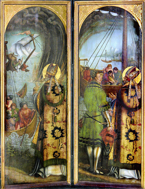 Nikolaus als Patron der Schiffer mit der Rettung von drei Pilgern aus Seenot.